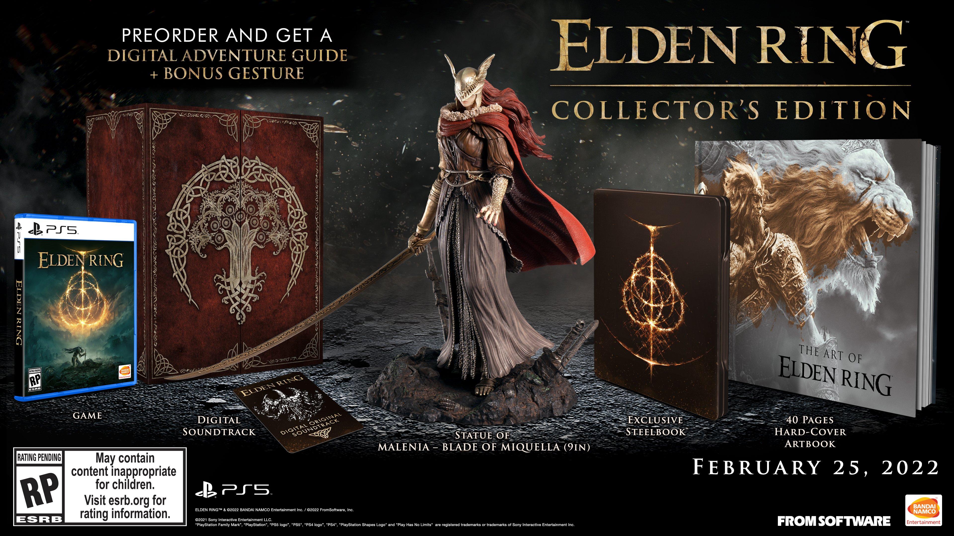Currently the only version that is available to pre-order at this time is the Elden Ring Standard Edition. - Physical ELDEN RING game disc - 9-inch statue of Malenia Blade of Miquella - Exclusive SteelBook featuring the Elden Ring - 40-page hardcover art book - Digital Soundtrack Pre-order to get a Digital Adventure Guide and Bonus Gesture. STATUE OF MALENIA - BLADE OF MIQUELLA A finely detailed figure of Malenia Blade of Miquella.